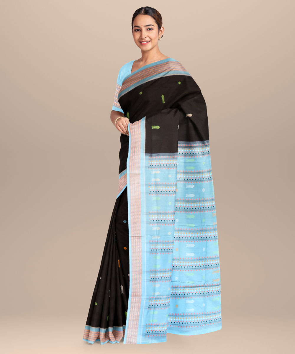 The sambalpuri weave is a bandha or ikat yarn tie dye textile of Odisha which is most popular for its culturally significant motifs inspired by the locals. These sarees come to you directly from the western clusters of Odisha at Bargarh, Barpali, and Sonepur. Each motif is designed symbolically derived from mythology, the coastal environment and the contexts of marriage and worship that is strongly believed in this part of the country. You can pick out your favourites from conch shell, fish, deer, butterfly, elephant, stars and many more iconic motifs beautifully woven on each of these sarees.